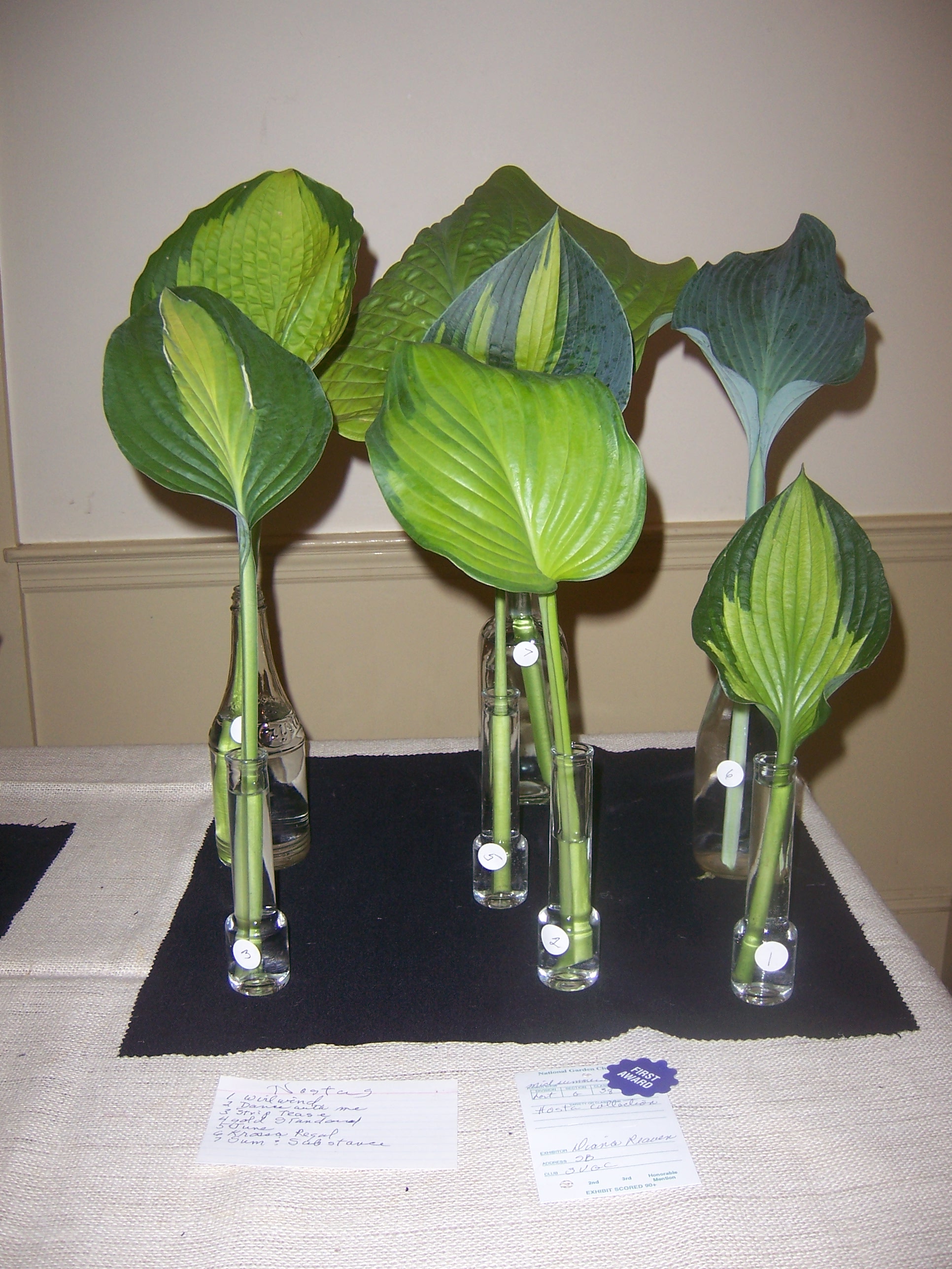 Of course, there could be some fun at the next meeting. It seems that the winner of the hosta collection competition only put one leaf in each of the vases. This clearly goes against the club’s unofficial rule that smaller varieties have three leaves to a vase, medium hostas have two, and larger leaves can be placed alone. I snapped a photo of the display. I saw a lovely hosta display, but the club members — well, they saw scandal.