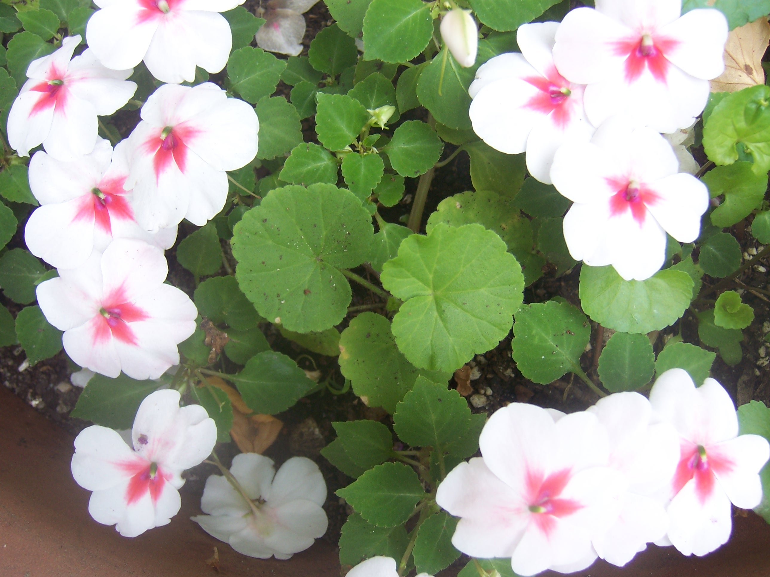 See those large round leaves in the middle. That would be a Geranium that has decided to sprout in a pot of Impatiens. I'm not sure how that Geranium got there, but clearly, I dropped a seed.