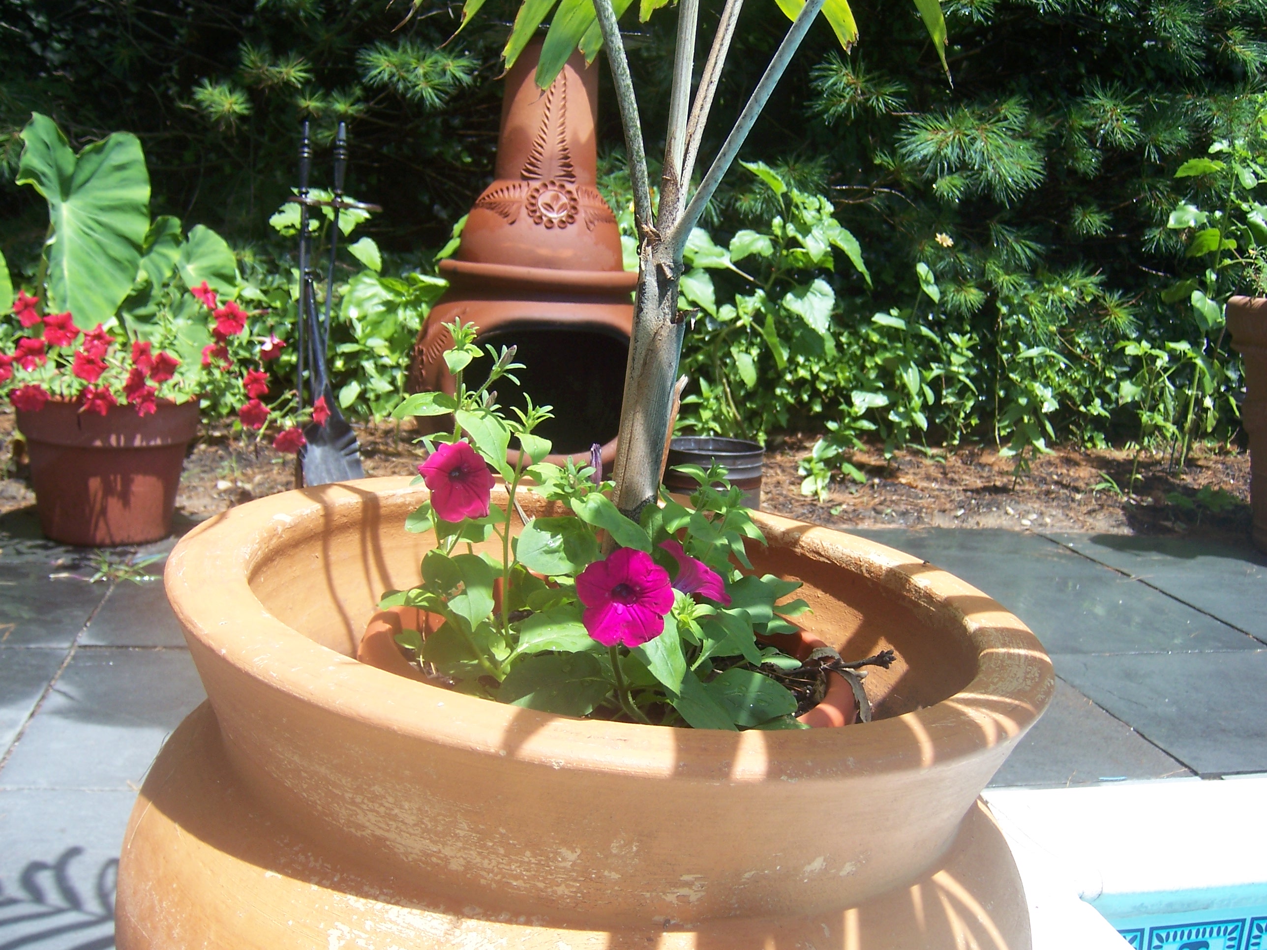 That large leaf in a pot of Red Wave Petunias is an Elephant Ear. This one has really thrown me, although I kind of like the lime green color of the leaf in combination with the red blooms. Or is that just me saying, "I meant to do that."