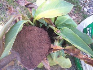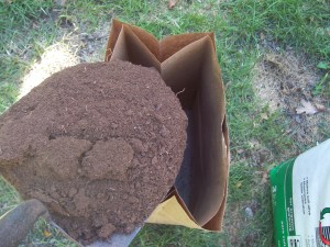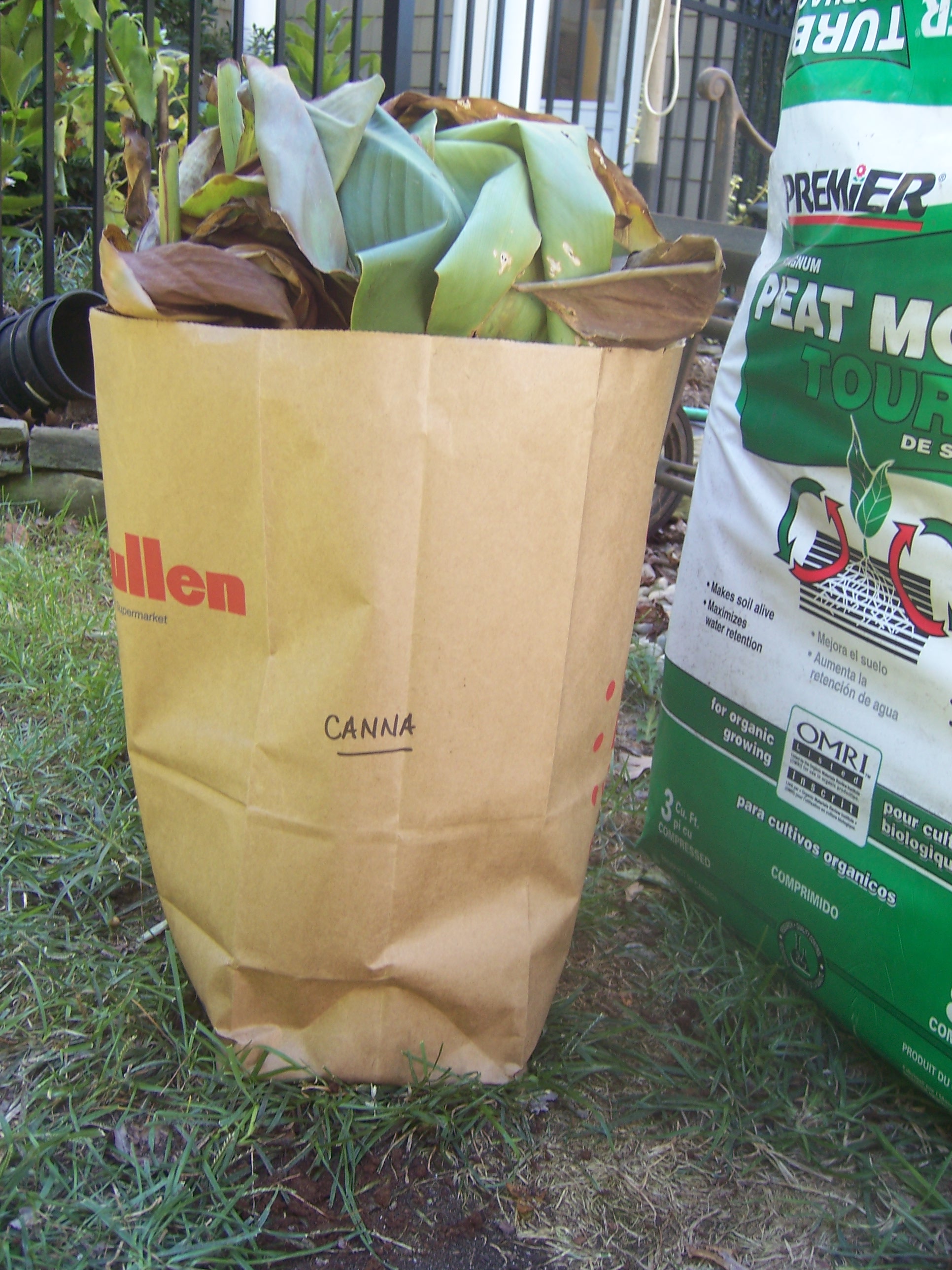 Step 1: Where Canna are concerned, I double up two brown paper bags and label the outside.  I then put a shovel or two of peat moss in the bottom of the bag so the corms have a nesting area.