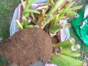 Now for the Elephant Ears.  Last year, I stored the Elephant Ear bulbs in a plastic crate lined with a plastic bag.  I’m not sure if this had to do with my loss of energy and wanting to finish the task, needing to save space, or just running out of bags.  Either way, it worked.   By the way, don’t be surprised if your Elephant Ears have continued to grow since you dug them up.
