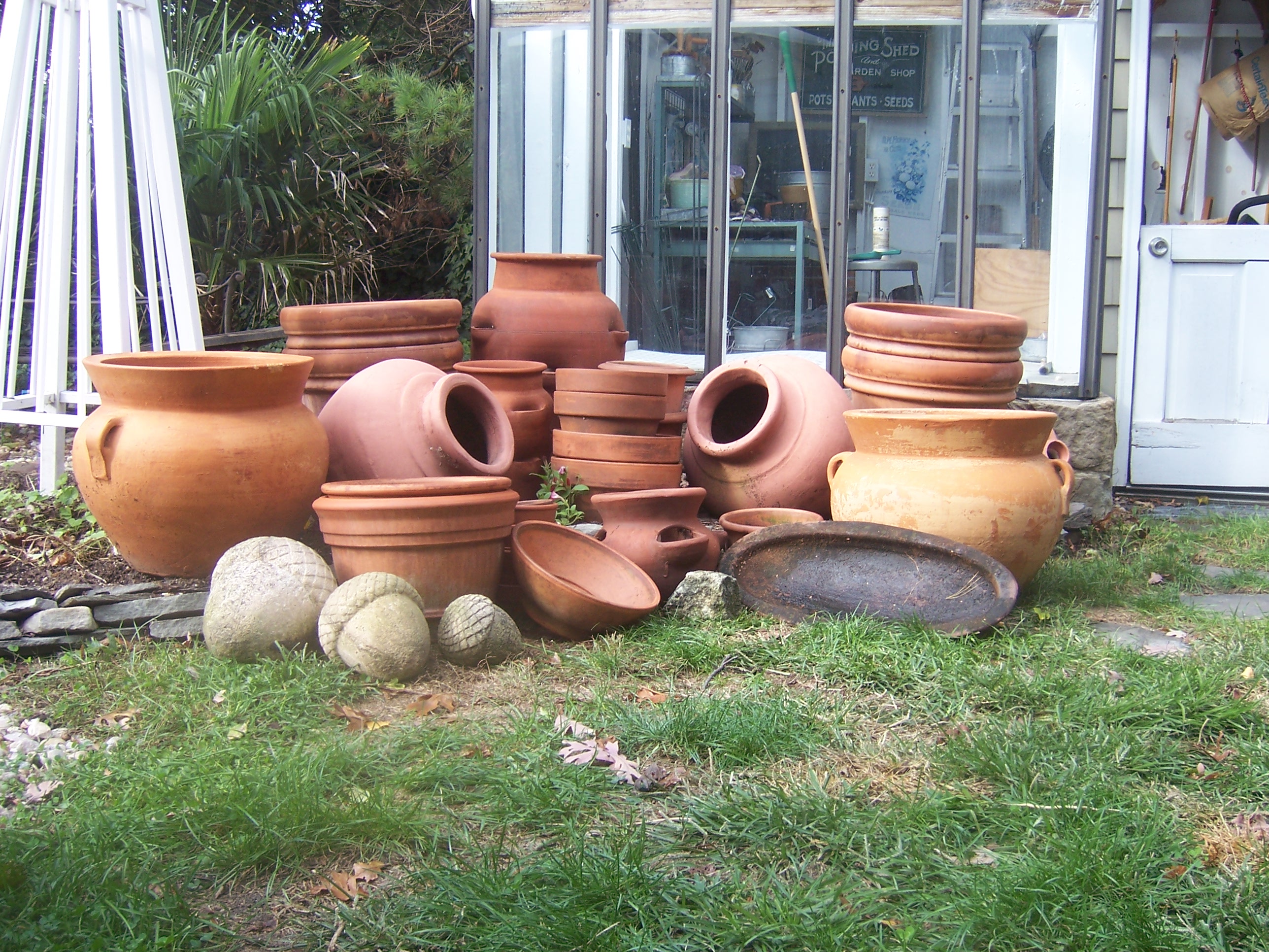 Gardening in terra cotta is tricky because the soil dries out rather quickly, which somehow seems appropriate for a material that translates to “baked earth.” I have learned to keep the terra cotta pots in shadier parts of the yard — and for that, I am rewarded with moss growing up their sides. Then, there is the matter of a Zone 6 winter and having to store them away. After I removed the plants and empty out the dirt, I let them dry in the sun so that I can remove any excess dirt. Afterwards, they are tucked into any available space: in the potting shed, up in the loft, in the garage — any place that will keep them safe from freezing and shattering.