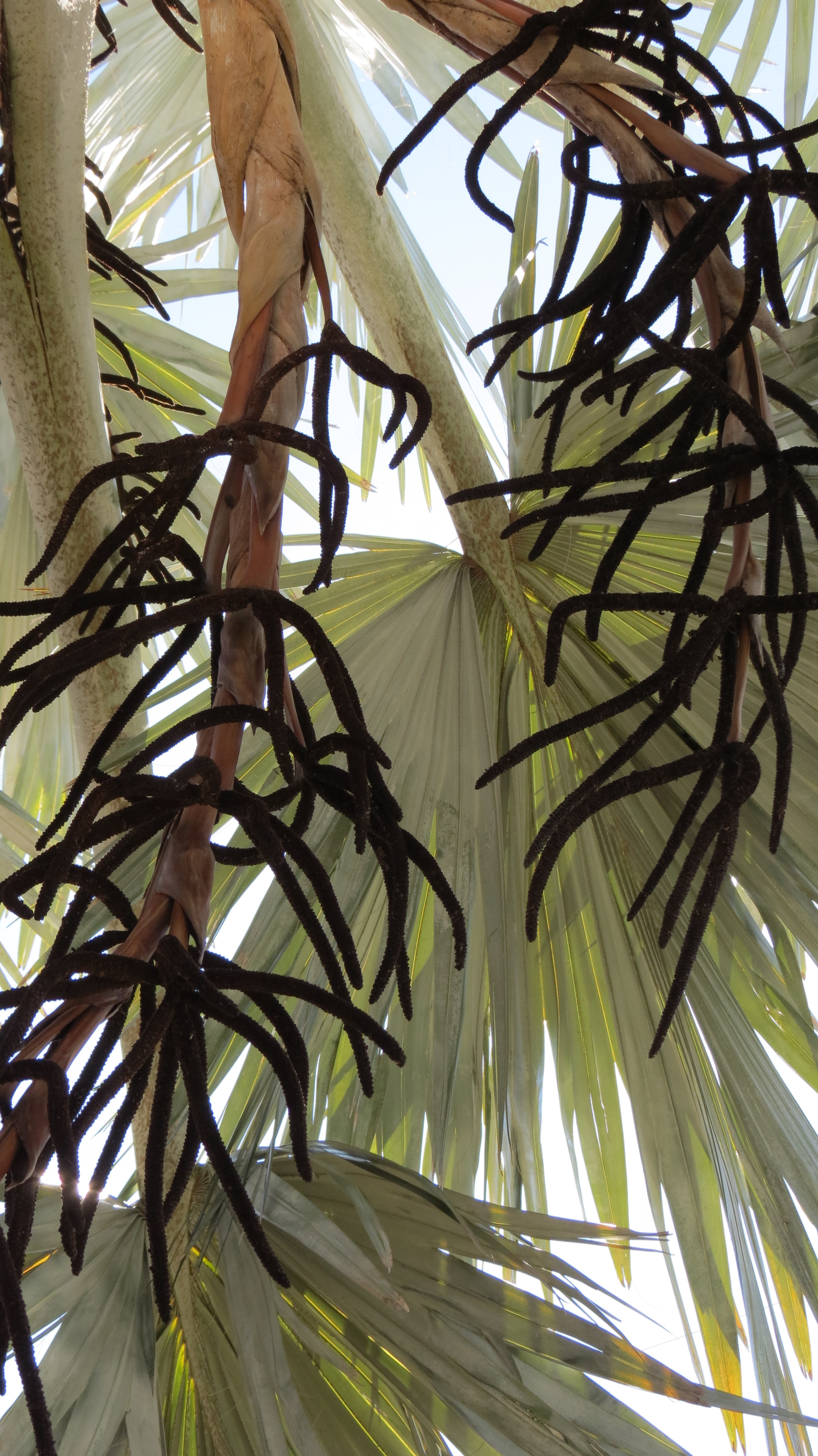 The silver foliage and reddish brown flower spikes of the Bismarck Palm (Bismarckia nobilis).