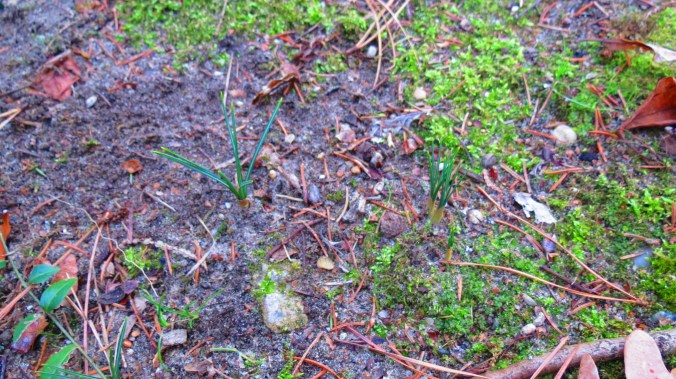 Huh?  But I have seen a crocus.  In fact, I’ve seen a couple.  They may not have flowers, but their grass-like leaves have emerged just outside of the dining room window.  And there are a few other hints of green sprinkled about.