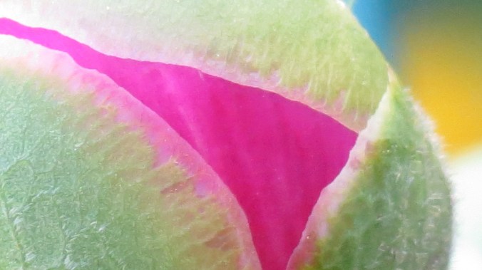 There it sits at the end of its stem, matter contained in a small globe as the pressure builds until a rift appears — a small hint of the wonder to come.