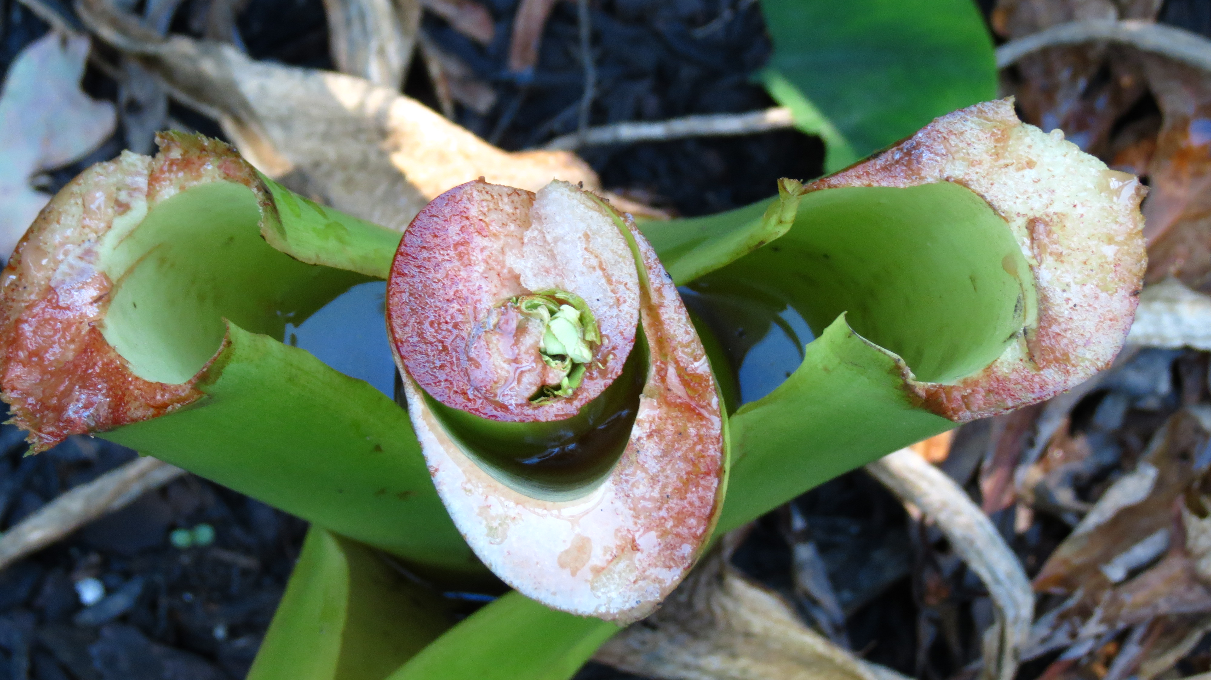 And if the blood wasn’t enough to bring on the guilt, take a look at the center of the center stalk. The button of green is an elephant ear leaf that never made it into the garden. Its time ran out; the seasons moved onward without it.