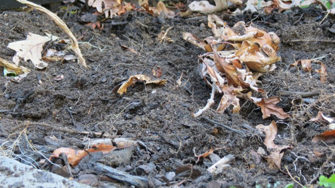 And then I caught my breath. There, at the base of one of newly dug canna stalks, was a plump bulbous shoot – canna that never made it to the surface.