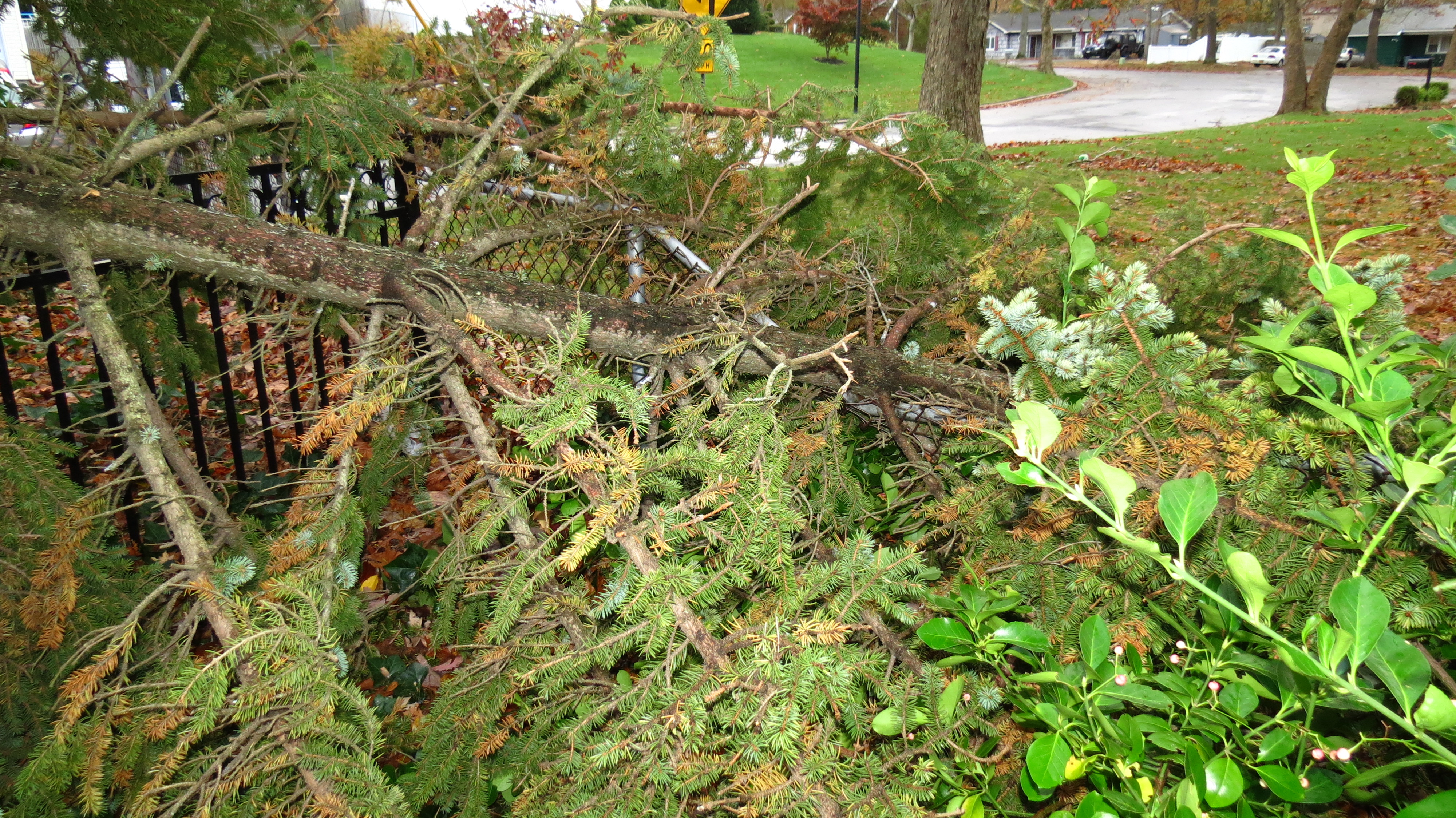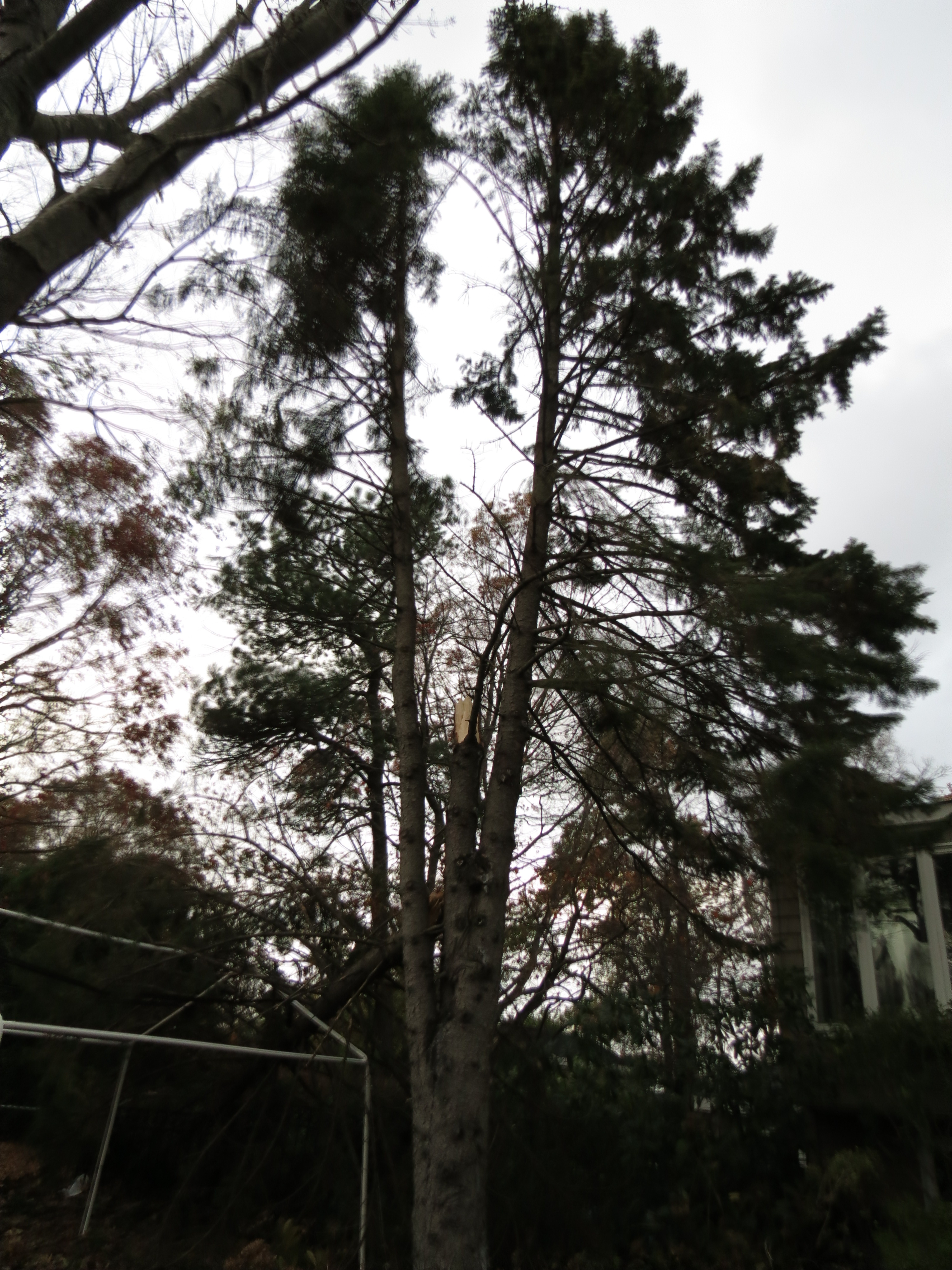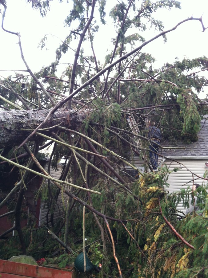 On the other side of the house, the neighbor’s evergreen fell completely over, ripping the electric box off of the side of his house. He was advised to shut off his power, and now a heavy-duty extension cord runs from our garage to his refrigerator.