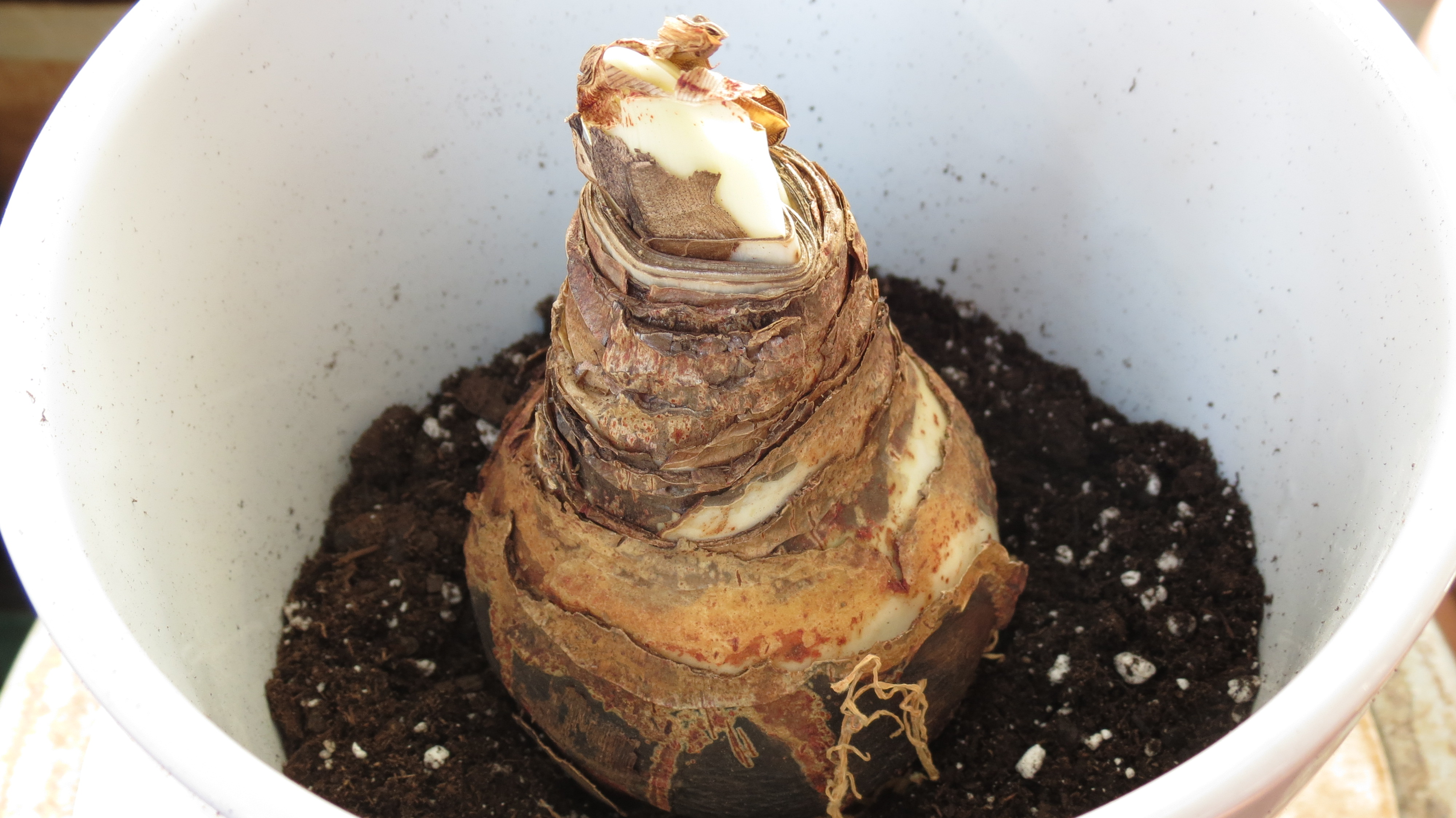 I filled the pot halfway up with potting soil, and nestled the bulb into it.
