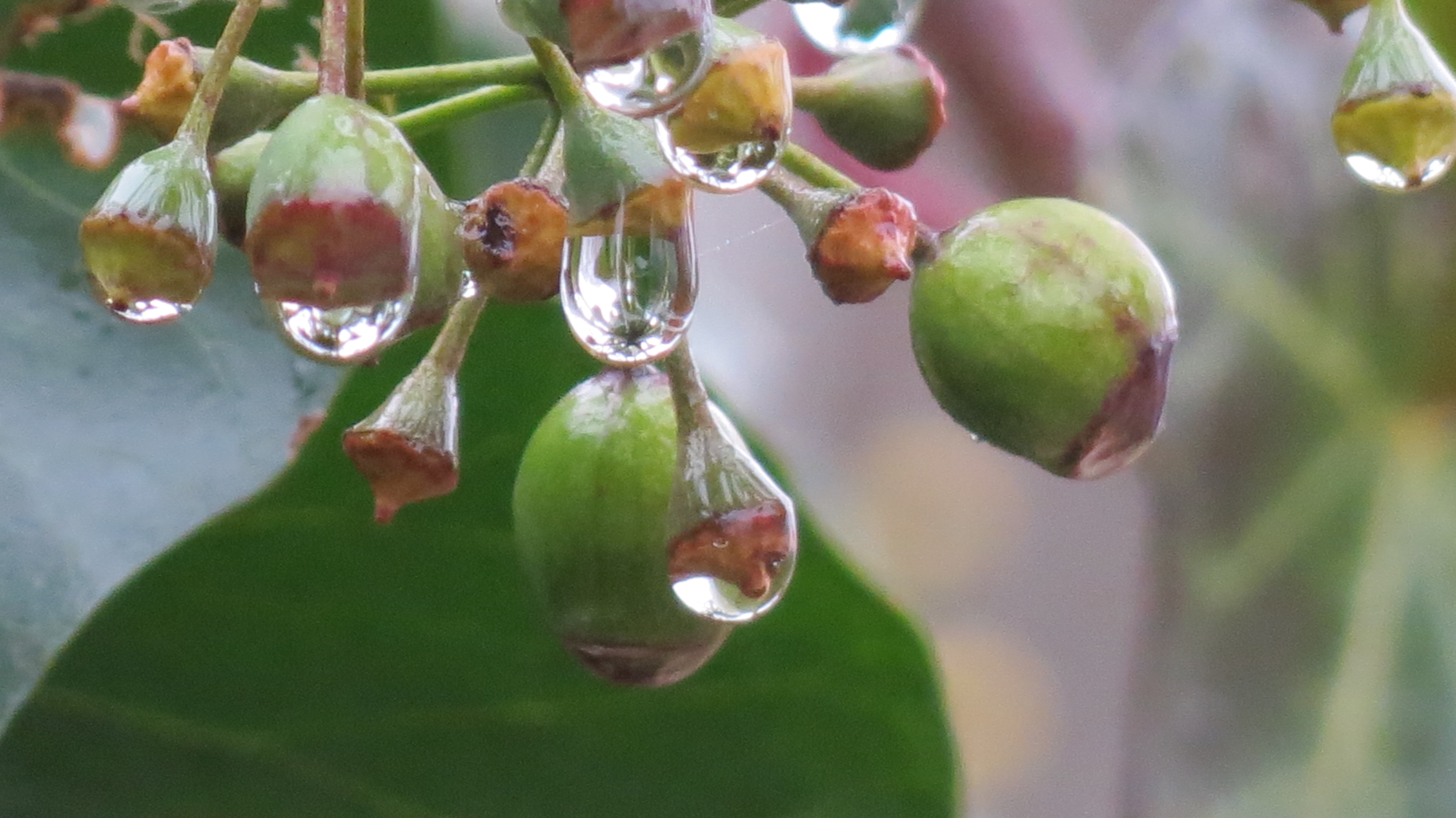 There is a section of Ivy that is more tree-like than vine. It’s the only spot with flowers and fruit, now dripping with water.