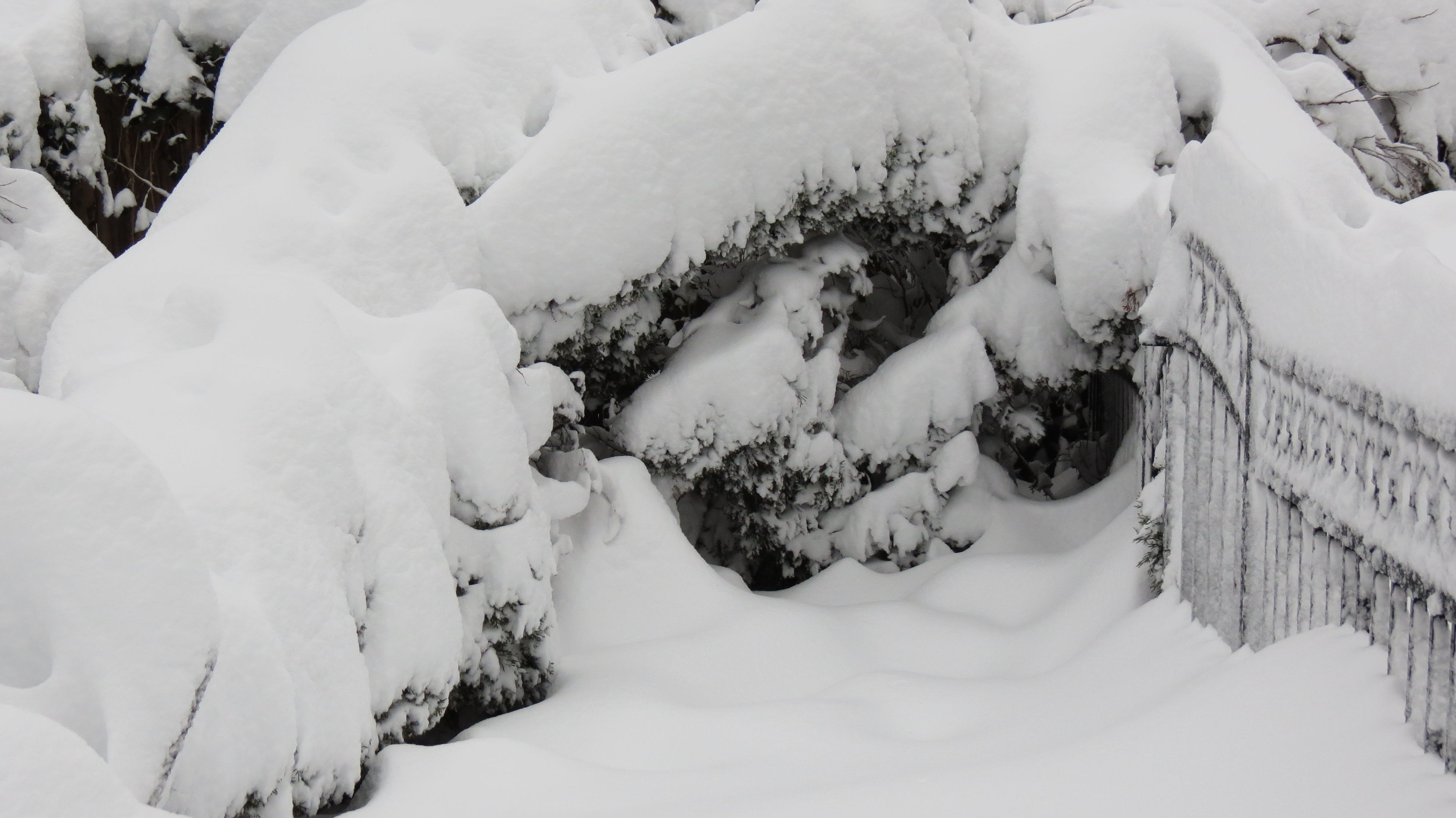 Having spent my first 40 years in Minnesota, I’m having trouble looking at that arborvitae – I want to rush outside with a broom. I believe they sort of stay bent over if you don’t get that snow off right away. Better put on the Sorels, Kev, and get whacking!