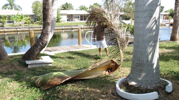 This is a single frond (above) from a Royal Palm. Once the frond has aged and served its purpose for the tree, it breaks away and crashes to the ground — a process which happens each day on palms. They constantly grow and shed — you just don’t want to be standing underneath when it decides to drop. A few cuts, and the frond is manageable and brought to the curb for pick-up.