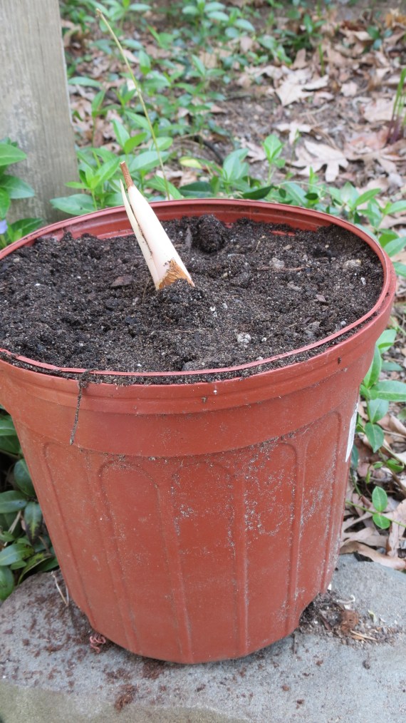 7. I’m sure I make more work for myself by first potting the Elephant Ear bulbs. With the pots, however, I feel I have more control over the plants. If there should be a frost, I can move the collection indoors. If a bulb fails to bloom, I won’t have an empty area in the garden.