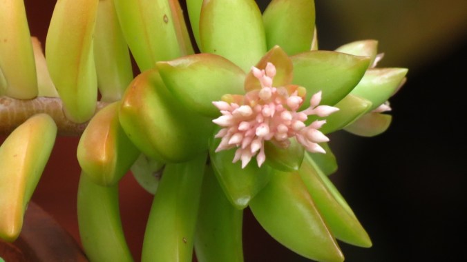 There is a small terra-cotta dish of succulents on a table on the patio. I never know which succulents will flower, so I’m always surprised when they do.