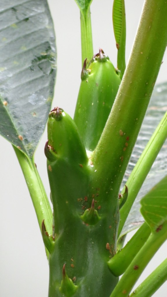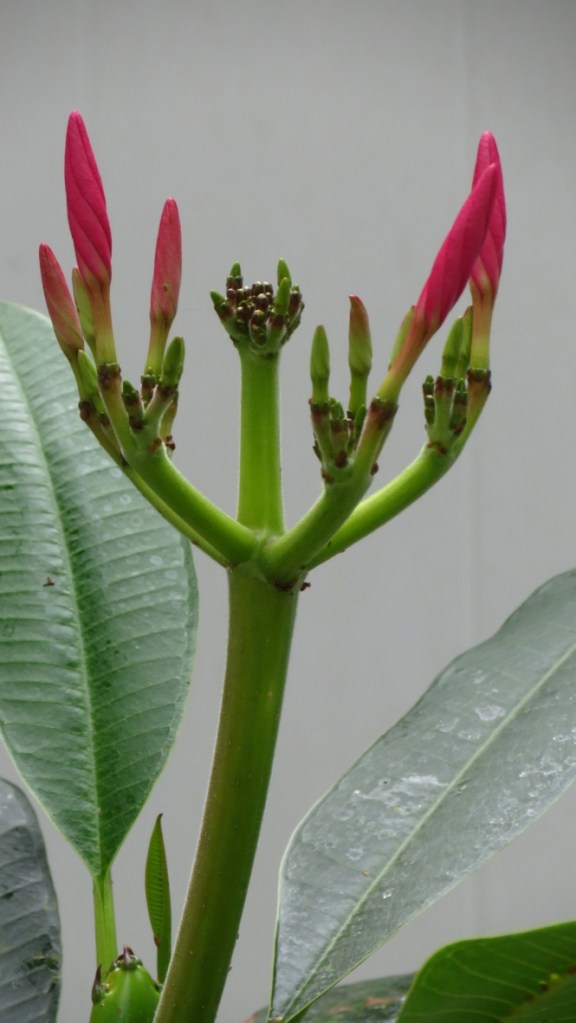 A funny thing happened to my frangipani tree, the one I posted about after winning it during a raffle at the local garden club meeting. The crown of the tree split into three — and as I followed the taller piece upward, it was capped with what I will describe as a candelabra of blossoms.