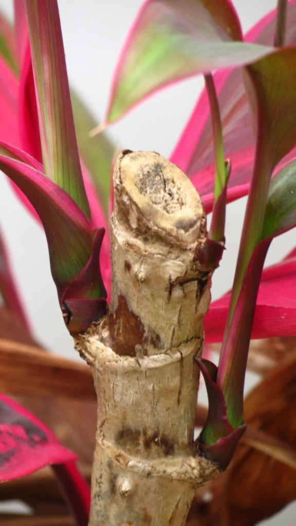 I love Hawaiian ti for its bright colors. I hate Hawaiian ti because as it grows, it gets a long woody stem and the bright leaves are clustered at the top.