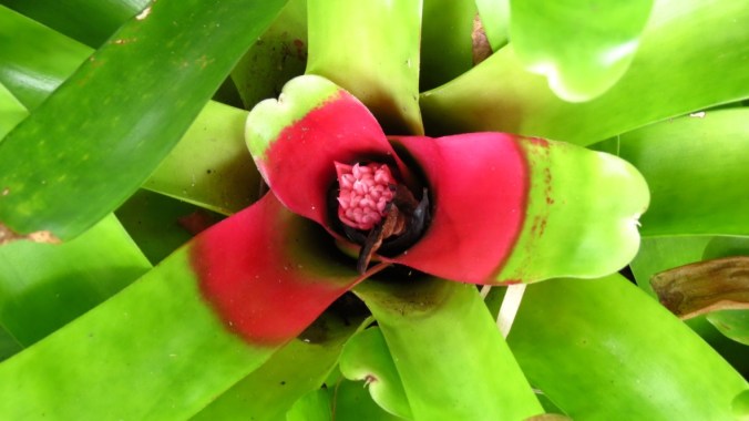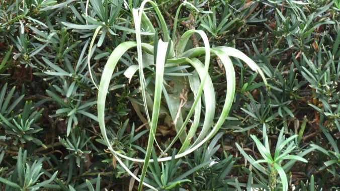 Tillandsia, which sounds like an exotic island, is a whole new world of plants for me — air plants, to be specific. A member of the bromeliad family, nutrients and water are gathered through its leaves while the roots keep it anchored to a host plant. Somehow, this one arrived in a podocarpus shrub in the front of the house. I’m not sure if it will flower, but I’m keeping my eyes on it.