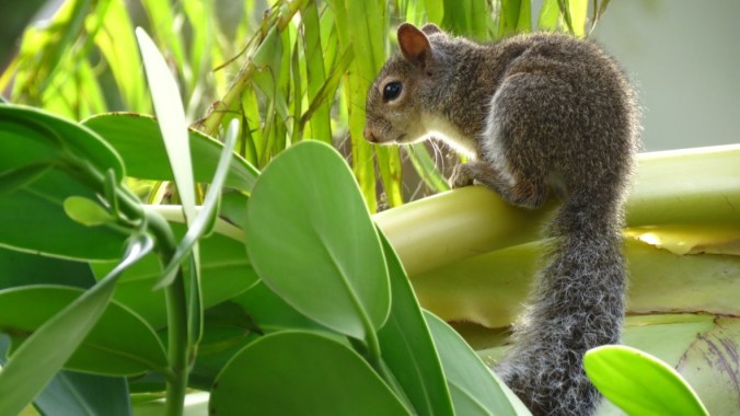 This little squirrel made it through the storm, and found a comfortable resting place on the trunk of a downed banana tree.