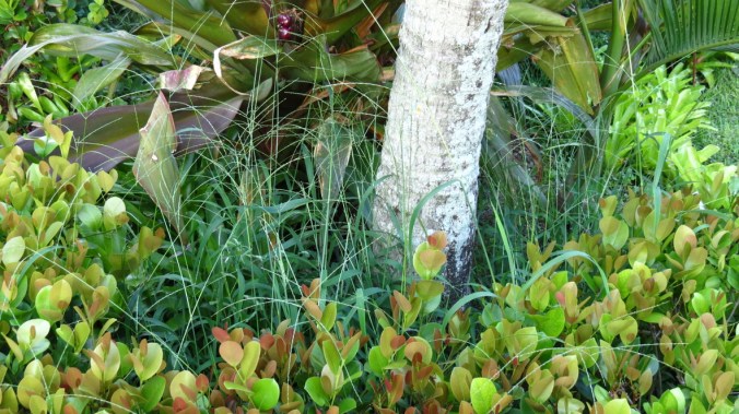 The front flower bed is in a state of transition. In other words, I stopped mulching it until I figure out my plan there. The weeds, as they often do, took advantage and grew taller than the coco plum hedge.
