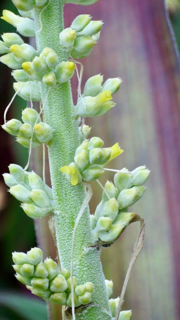 Quite recently, I moved the bro to an area that received more sun — and the spike appeared. The stalk, dusted in white and looking like a ghost, was covered with small buds. These eventually opened into small yellow flowers that reminded me of straw flowers.