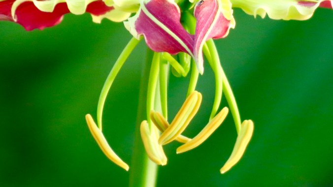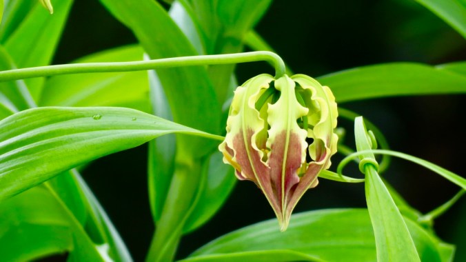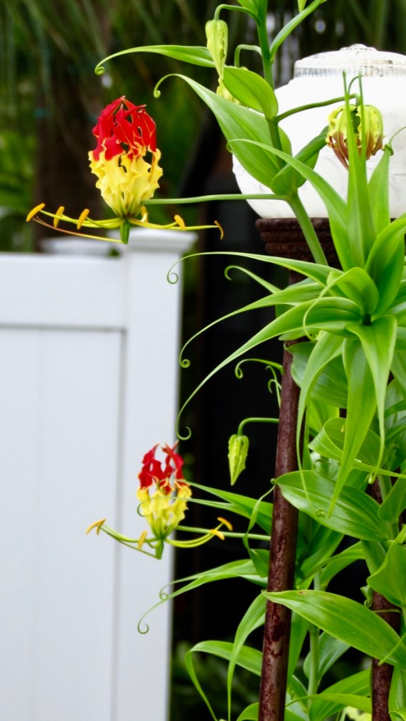 I refuse to cut off this first flower and to place it in a vase to be brought into the house. While that will eventually happen with other Gloriosa flowers — so I can enjoy my obsession while inside — I’m too excited to watch what this one does on the vine.