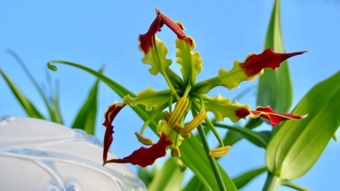 I’ve become a little bit obsessed with the Gloriosa Lily ever since I spotted it casually rambling over my friend Neil’s shrubs. The vining plant was so intertwined with the neighboring plants that it looked as if its exotic flowers were part of the shrubs. On top of that, the flowers last a very long time when cut and placed in a vase. Even the cut buds eventually open!