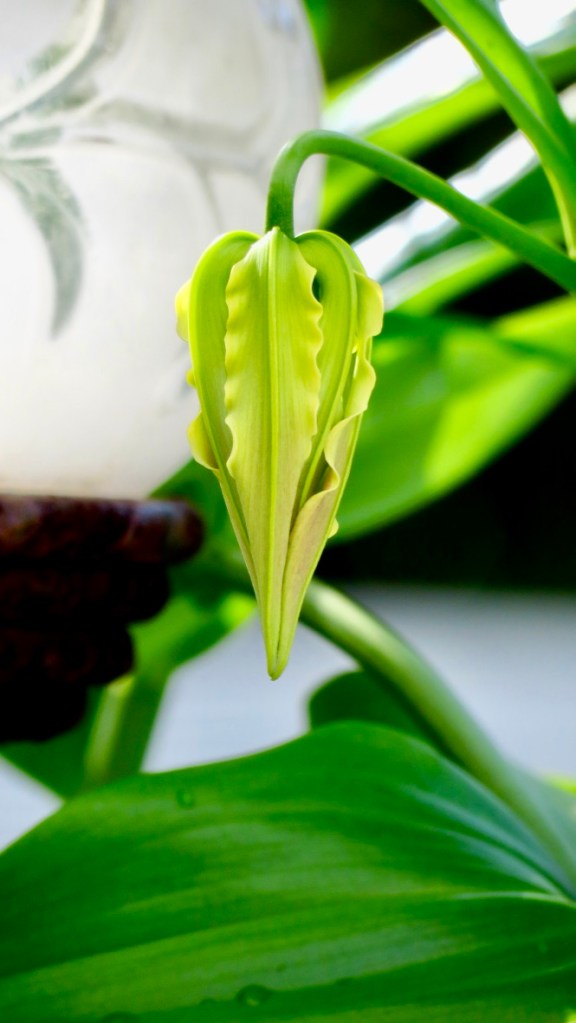 By the time the plants reached the top of the trellis, the first bud appeared. My morning ritual then included an examination of the bloom for any changes. Heck, whenever I walked passed the pot, I studied the blossom and noticed how the seams appeared to pucker and ruffle.