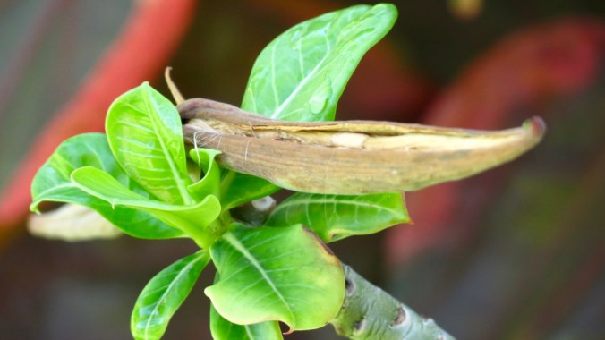 A long time ago— May, actually — in a galaxy far, far away— just outside of the front door — an alien-looking seed mustache from space appeared on the tip of a desert rose branch. That was the general gist of an earlier post — but after a couple of months, my sci-fi fantasy that is South Florida gardening has become, “Captain, the pod doors have opened.”