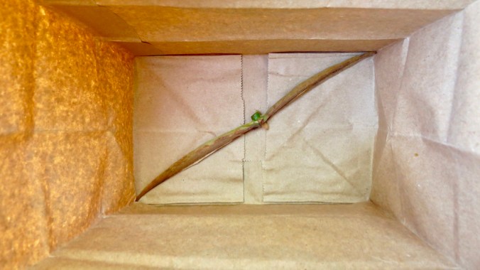 The YouTubers then recommended that I remove the entire seedpod and place it in a plastic container or a paper bag — and then to keep that in a dry place for a few days. After cutting the pod from the plant, I lowered it into a paper bag, brought it into the house, and waited.