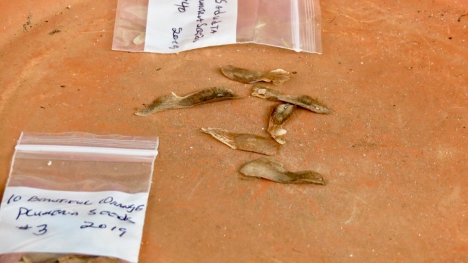The seeds resemble maple seeds, helicopter-like so the wind can carry them and they can whirlybird down to the ground — because, as I now constantly remind myself,  frangipani are trees and trees can be grown from seed.