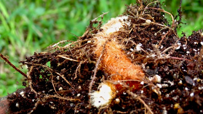 The roots of the ferns and weeds had completely filled the soil, making a sort of burlap close to the sides of the pot. My good ol’ thrift store sifter came in handy, as I salvaged what soil I could.