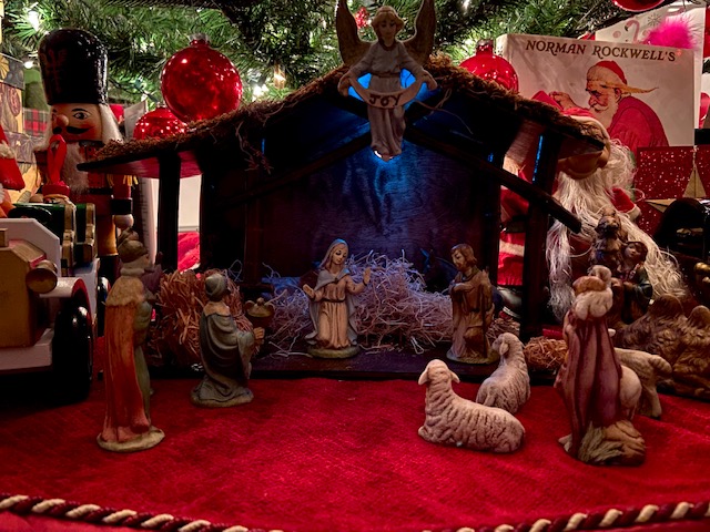 Front and center, is the nativity. My mother made the figurines in ceramics and my father built the crèche using branches from a tree in their front yard, my childhood home, and modeled it after their own crèche.
