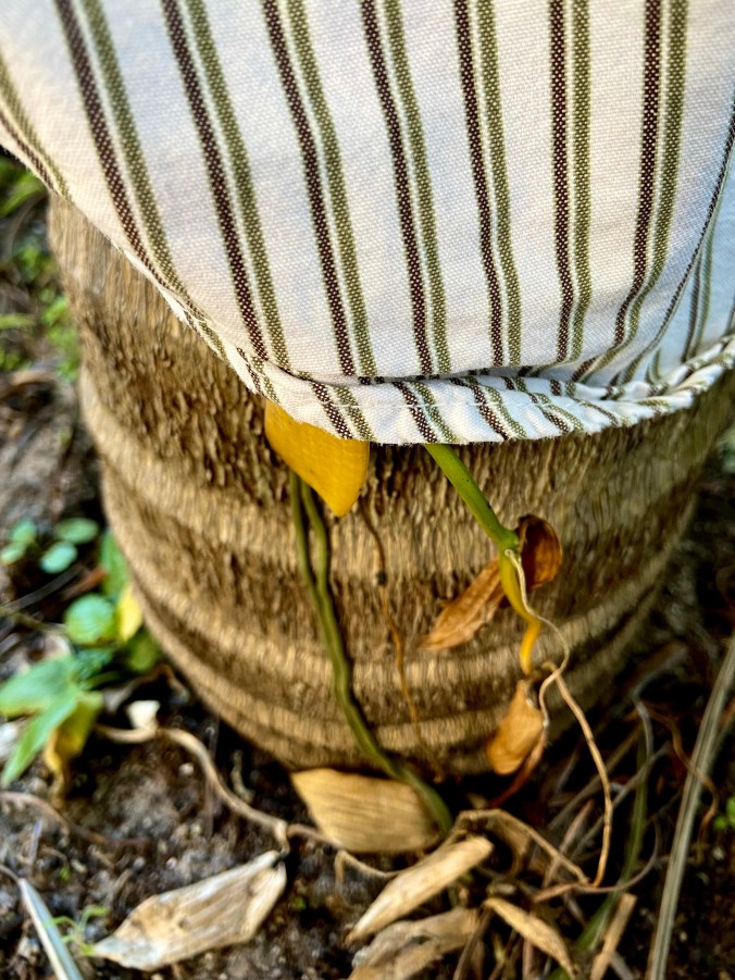 I first tackled the two vanilla bean orchids planted in the ground, the ones I had wrapped in old shirts to give them a warm hug. At first glance, I noticed one plant had a yellow leaf peeking out from the lower hem of the shirt. It must have gotten left out of the hug in my attempt to protect the new growth at the tip of this climbing plant.