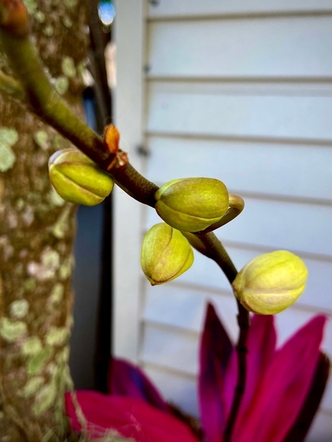 The cold snap from the previous post lasted that entire weekend. Out of an abundance of caution, I kept the outdoor orchids wrapped under towels and shirts, while the potted orchids were kept inside. On Monday, winds died down and temperatures became more seasonal.