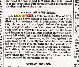 Within minutes, Captain Lawrence was hit twice, and his first lieutenant was also injured. Mortally wounded and leaning against the capstan, Lawrence was, according to Ebenezer’s 1882 obituary in The National Tribune, “supported by Loud.” From that position, he continued to issue orders to his American officers, “Don’t give up the ship,” five words that would live on in naval history. Quickly, though, officers ordered that he be brought below deck, which left no leadership on deck at a critical moment in the battle.