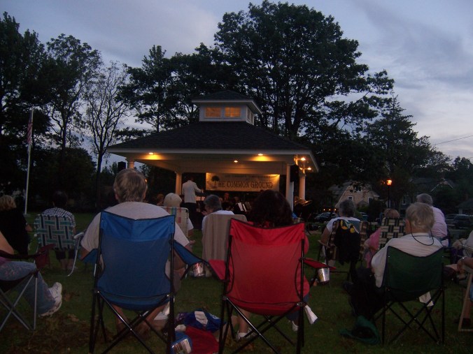 Recently, I had the pleasure of returning to The Common Ground, this time to see another, more musical side of a community garden.  Our friend plays saxophone with the Atlantic Wind Symphony, the oldest fully professional concert band on Long Island.  This photo is the view from my lawn chair.  It was a beautiful night, much needed after an earthquake and a hurricane.  The band entertained the crowd with marches, standards, show tunes, and popular music.  For me, the highpoint was a military set, with a song from each of the branches.  Before the set began, the conductor asked veterans from each of the branches to stand up when their particular song began.  To see these men and women, of all ages, stand for their branch and be recognized was quite emotional.