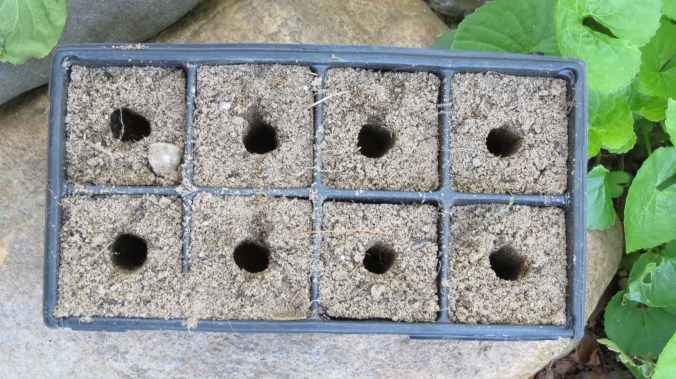 4. At this point, get the root starting cells ready. Sandy soil tends to work best because it’s not heavy, which is easier for developing roots. Use a stick (a chopstick or a pencil works great) to make a hole where the stem will be inserted.