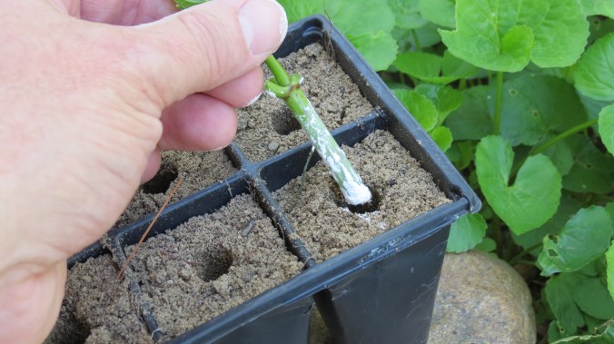 9. Place the stem into the prepared soil, being very careful not to brush off the rooting hormone as you insert the stem into the hole. Once placed, gently tamp down the soil.