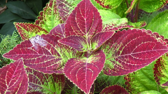 On this very hot and very humid day, there are few visitors approaching the ornate gateway. The sedum in the iron birdbath seems to enjoy the heat, but the big-leafed coleus is much more content in the shade of the enormous archway.