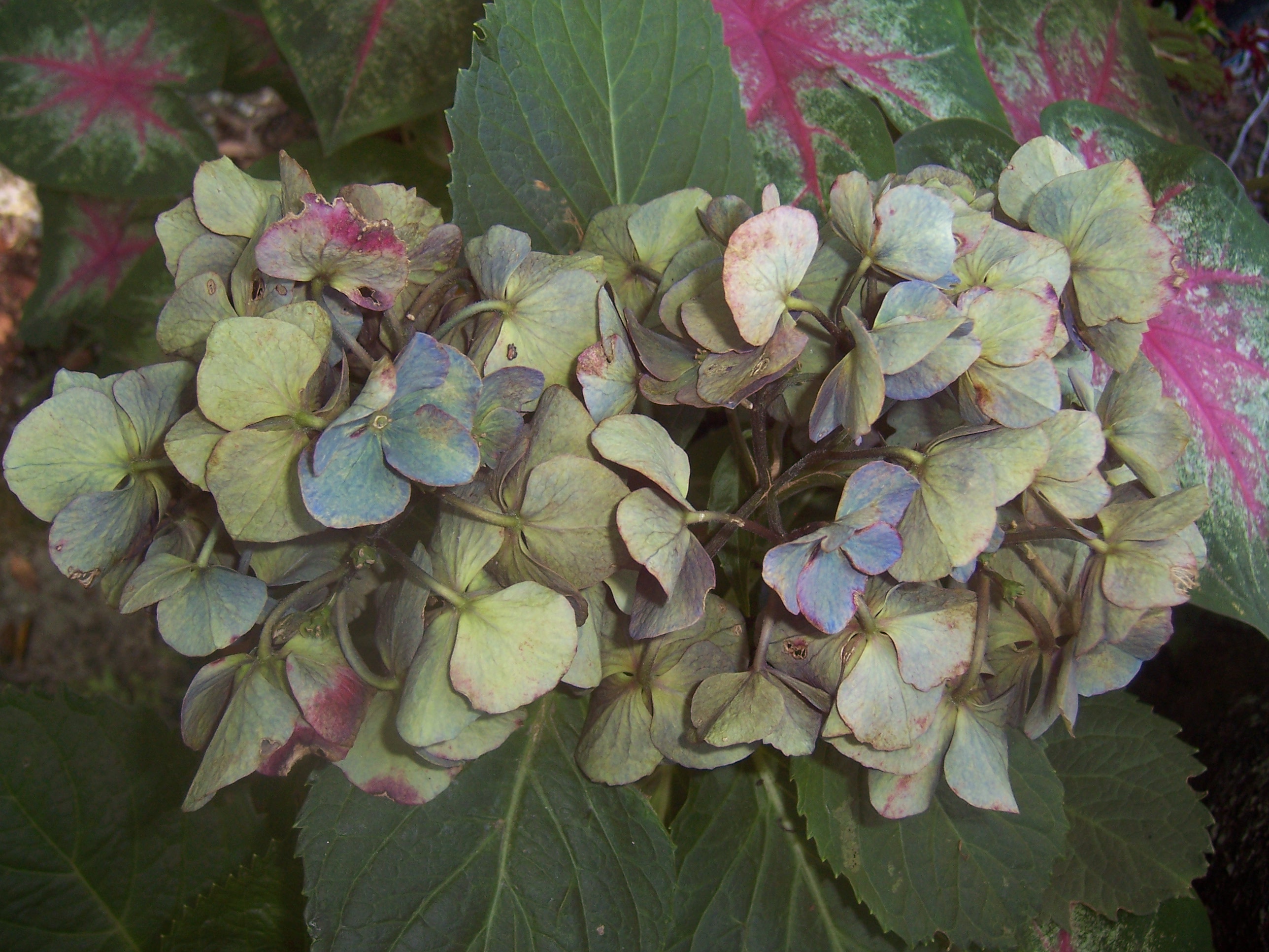 A few of the old standbys: a faded Hydrangea (take that Madonna!), Liriope spikes, Coleus “Tartan,” and a Caladium close-up.