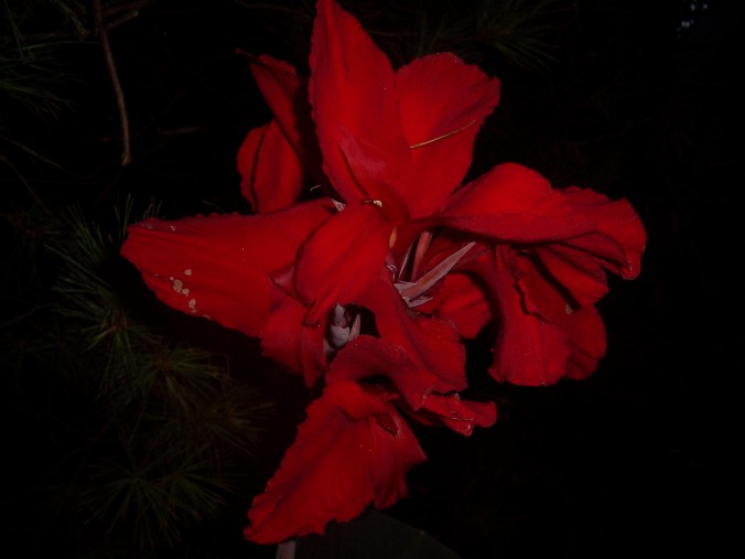 Then, in a matter of hours, a cold front roared through. The clouds thickened and darkened, the wind grew stronger, and fat drops of rain splattered everything. And all the while, the temperature plummeted — so much so, that by sunset, it felt like late October. When I looked out of a window, I saw the last canna bloom (was that a shiver?) glowing. I again grabbed the camera, this time to capture the canna’s last stand — and I was blown away by the vividness of color.